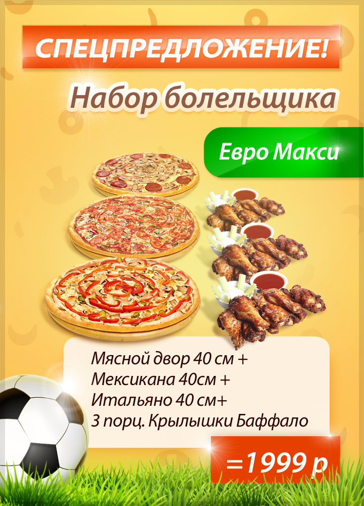 Болельщики, футбольные фанаты и просто любители вкусно поесть! Сегодня нашей сборной по футболу предстоит сразиться в матче отборочного турнира с Северной Ирландией. К такому делу нужно быть готовым. Заказываем Наборы Болельщика! Болеем за нашу команду! Едим вкусные крылышки и горячую пиццу! Оле оле-оле-оле! Россия - вперед!
